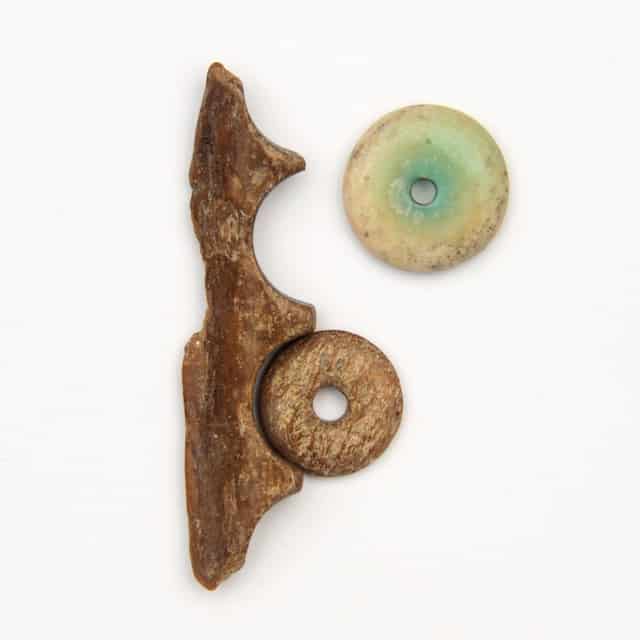 Above are the ‘moulds’ from two ‘death’s head buttons’. Often made from wood or bone, these were painstakingly hand-wrapped in thread – perhaps silk or linen – and take their name from the crisscross pattern’s resemblance to a skull and cross bones.