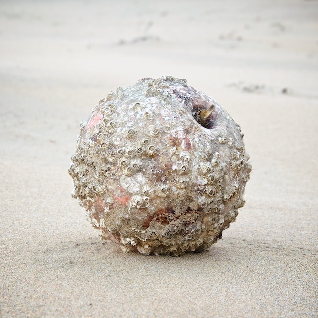 Looking rather like a bead of expanding foam, the buoy is often attached to flotsam as well. This can be almost anything that floats, including cuttlebones, plastic bottle tops (above), even the tar balls that result from oil spills.